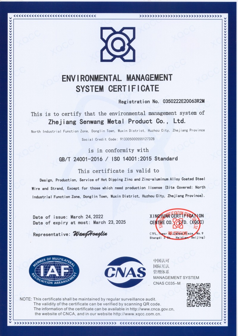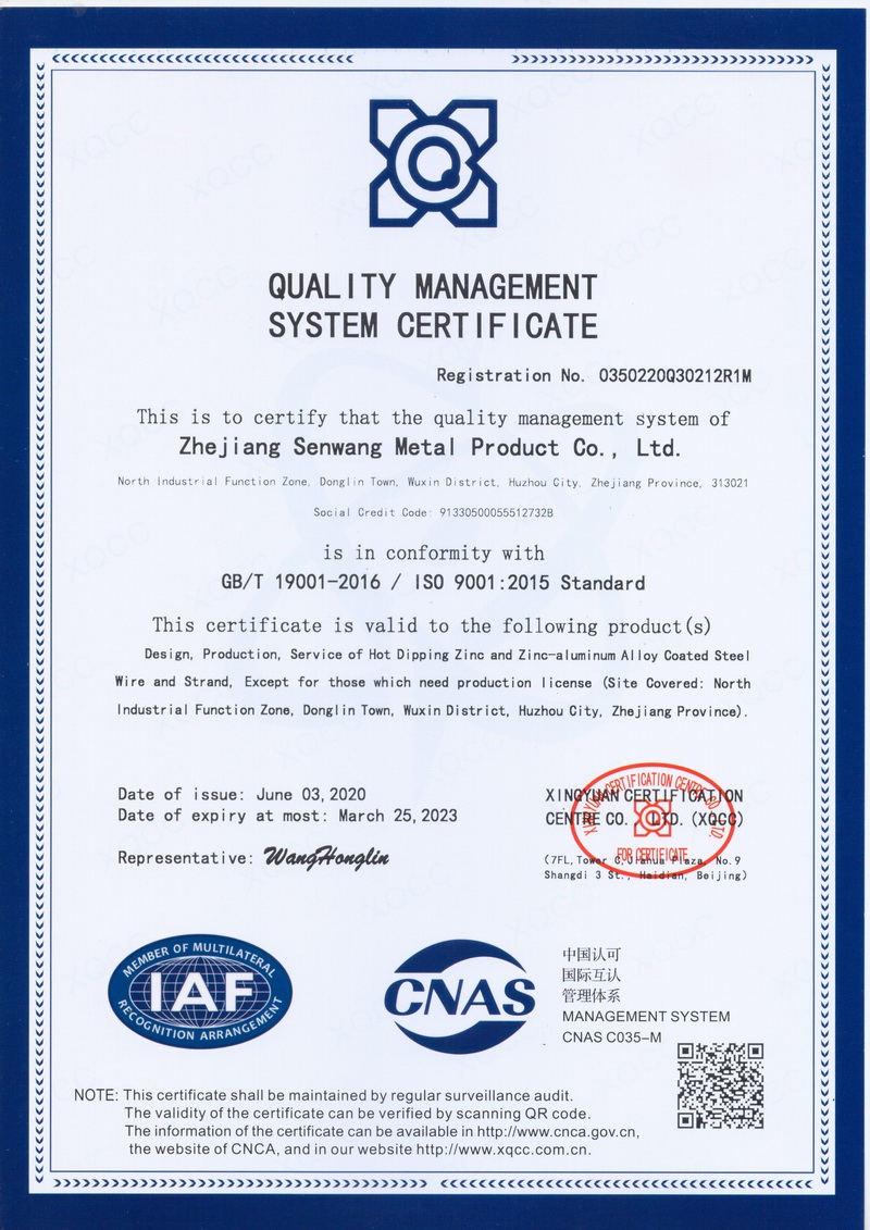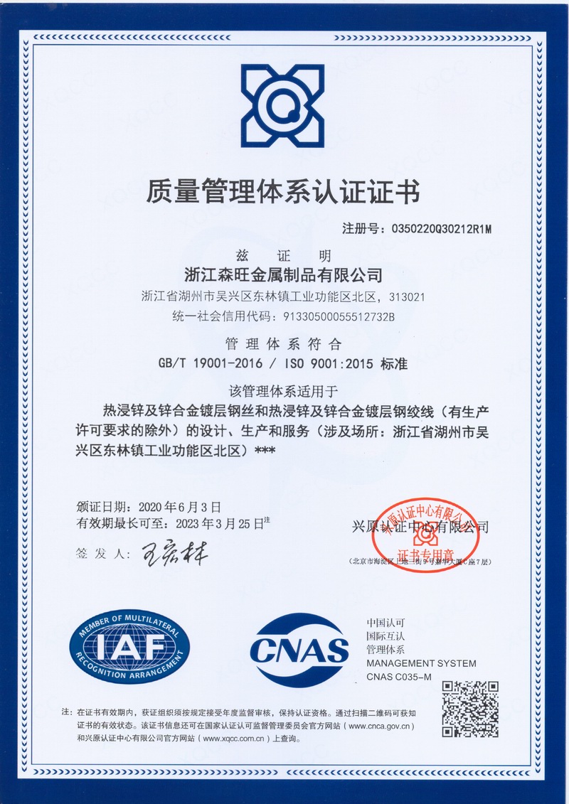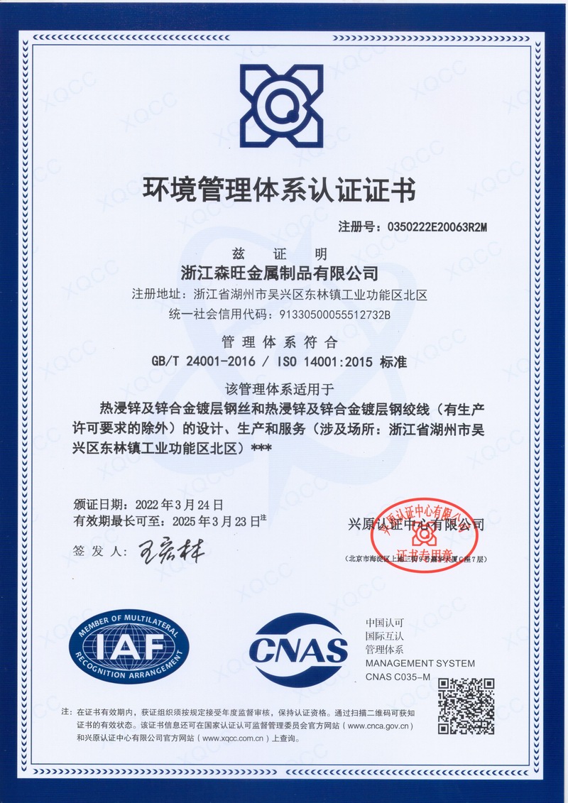 浙江森旺金屬制品有限公司成立于2012年,坐落湖州市吳興區(qū)東林鎮(zhèn)工業(yè)功能區(qū)。公司專業(yè)從事各類鍍鋅鋼絲、鋼絞線等產(chǎn)品的開發(fā)及生產(chǎn)。目前產(chǎn)品已廣泛應(yīng)用于各類通信光電纜,電力輸送,電氣化鐵路工程,各類堤壩防護(hù)及農(nóng)業(yè)溫室等工程領(lǐng)域。公司秉承“追求卓越品質(zhì),創(chuàng)建卓著信譽(yù)”的經(jīng)營理念,始終堅(jiān)持專業(yè)化、規(guī)?;慕?jīng)營模式。